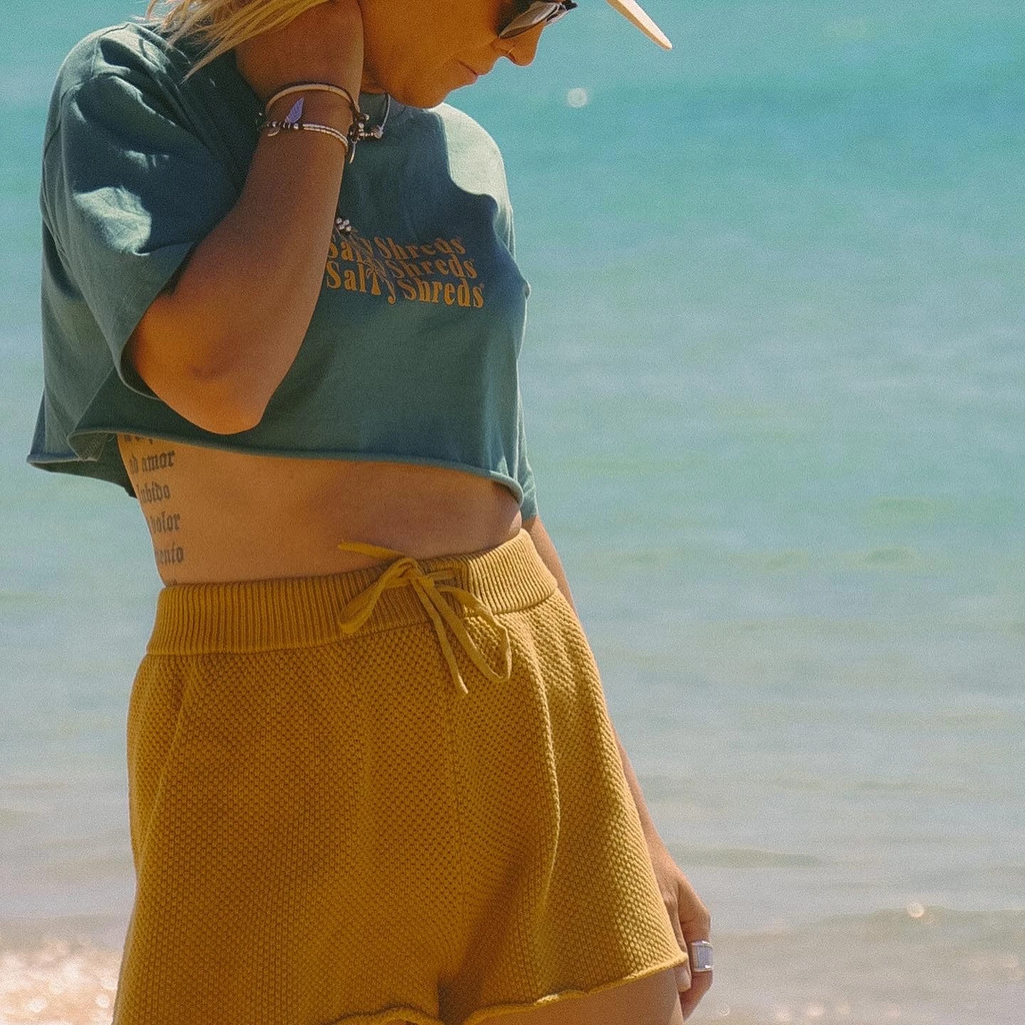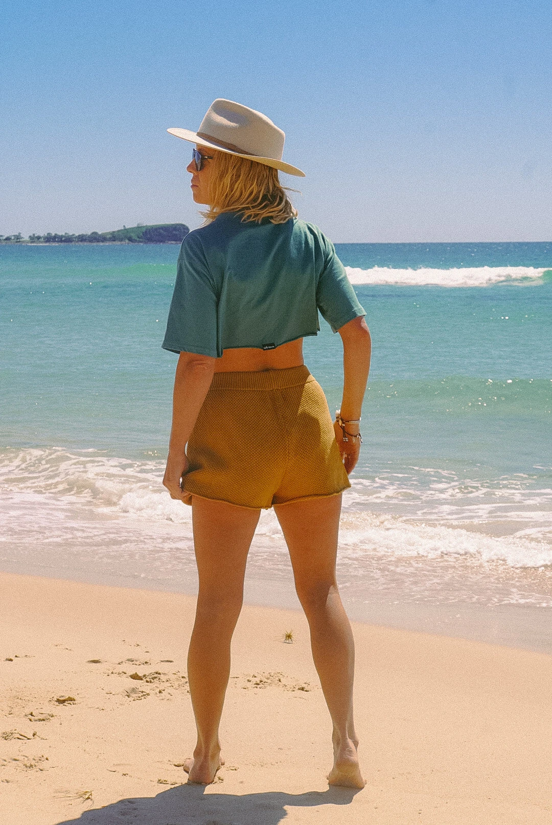 Another rad staple for not just you, but our Men & Groms too! Our gold and green tees are a must have for the whole family. Perfectly worn with any of our high waisted shorts, or as an under garment with our overalls.